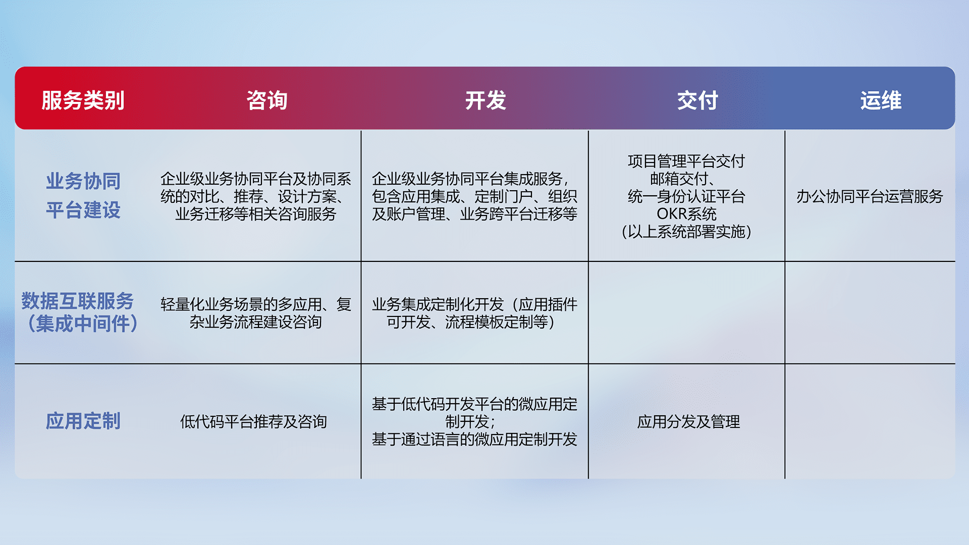 针对钉钉、、企微、、、IDaas等平台级产品提供产品的规划、、、、方案、、交付、、定制化开发等服务,,,,实现如统一协同办公、、智能客户服务、、、、混合会议管理、、、智能数据查询、、等业务场景,,,,实现数字化转型。。。。