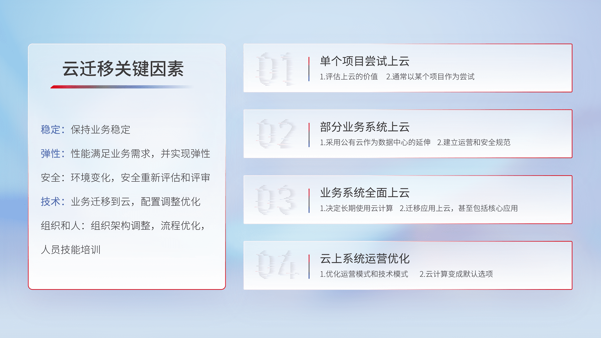 结合实际业务,,,,从规划设计、、、云平台选型、、云原生改造、、、数据迁移、、、集成交付,,,,迁移全过程为客户识别最佳上云路径,,,,做好风险识别管理,,,设计网络架构、、、身份权限、、、安全审计合规、、操作审计、、、、日志审计、、、、监控告警策略、、多站点容灾设计等,,对云上基础设施进行整体规划,,提升IT治理水平,,,,以满足弹性、、、高可用、、、、高性能的需求。。。。