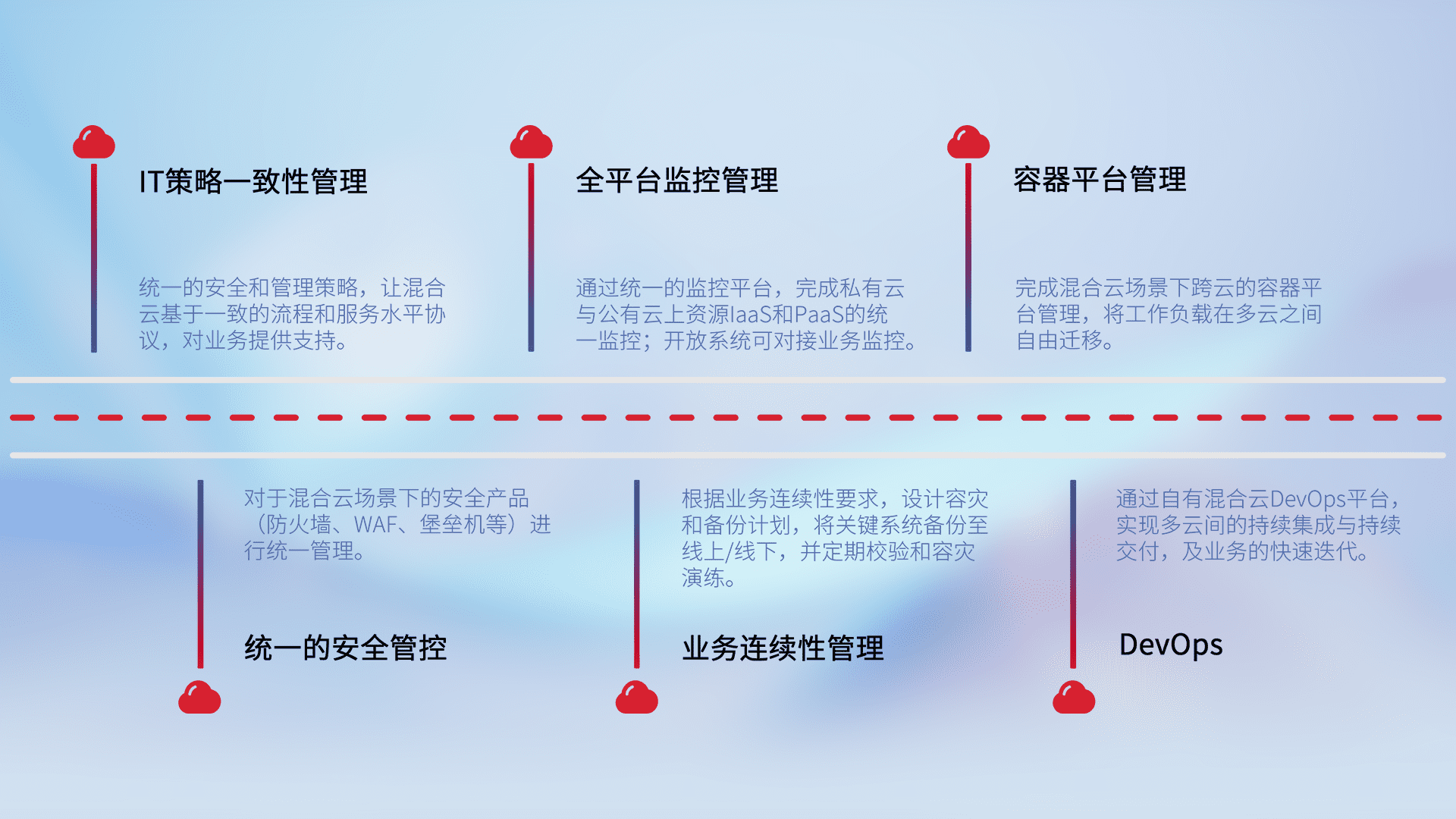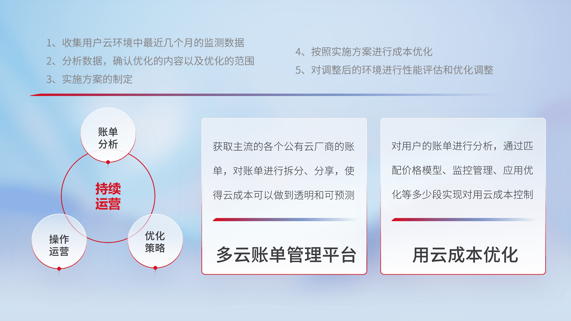 通过多云纳管,,,以统一的资源数据模型把客户的云资源进行抽象和封装,,进而实现对多云资源的统一操作,,,保障云资源管理的可靠性、、稳定性与可用性。。。。量身定制化运维内容,,,配置、、、开发运维、、、补丁管理、、、备份、、监控、、认证和访问管理、、、审计和日常巡检等,,保障在用云过程中的可靠度,,,稳定度以及高可用率。。。。